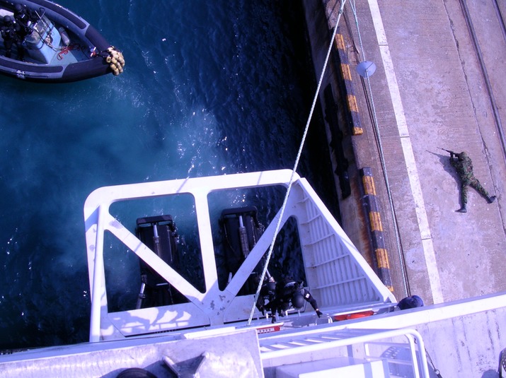 Boat team, climbing onto deck. The guy on the ground there is a security guy guarding the approach?