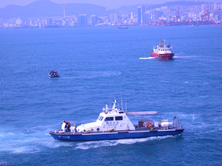 The boats participating in the exercise, on the top left is the fast police boat, top right is a fire boat, and the bottom boat is a police boat.