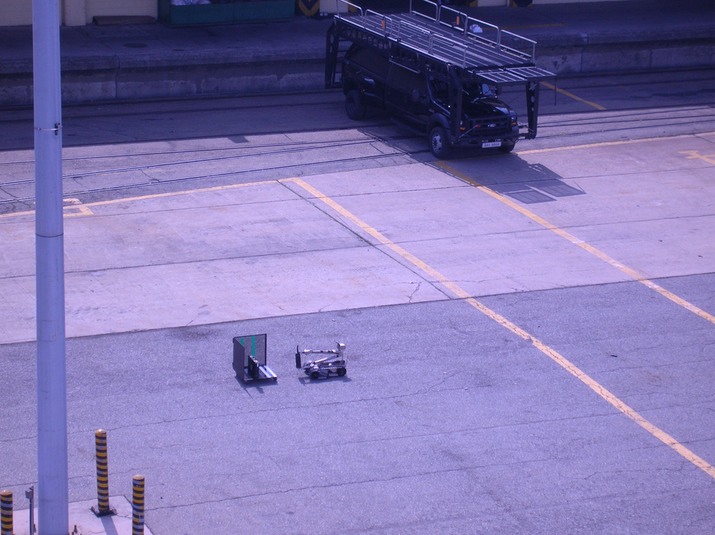 Small robot delivering a clearing charge to render the suspect package harmless.