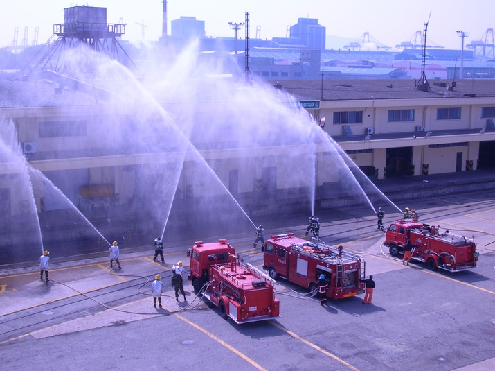 Fire trucks, hoses, water.