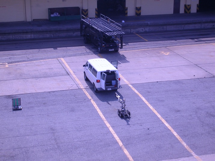 Robot moving in to remove suspicious package from van.