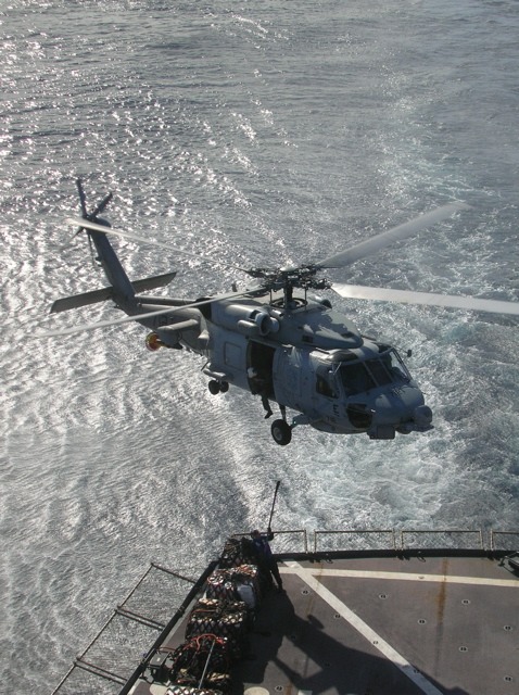 The guy on deck has to hook the sling onto the bottom of the helicopter.