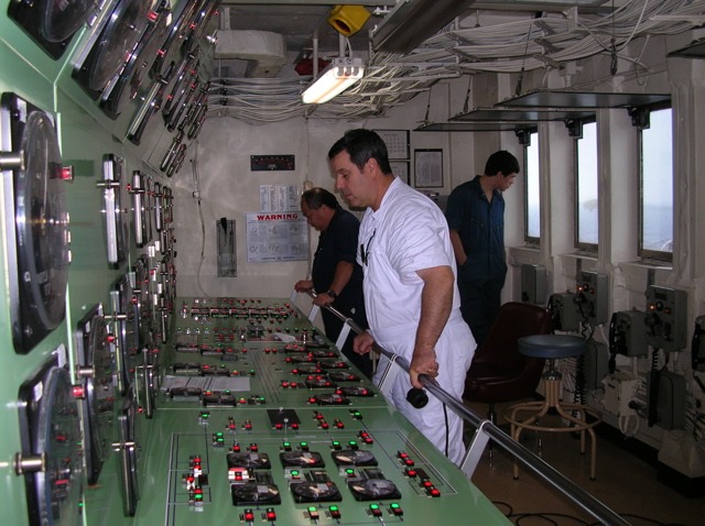The cargo system and ballast system are controlled from up here. One of the electronics techniticans and the Cargo 2A/E are watching over the transfer. The cadet at the window is observing the USNS Bridge and the work going on on deck.