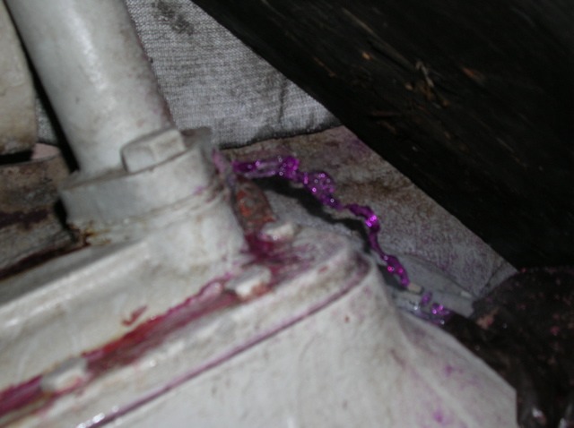 We suffered an engine casualty when a gasket failed on the port engine. The purple liquid squirting out is cooling water.