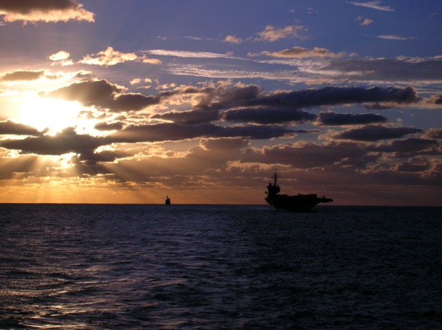 The USS Cowpens and USS Kittyhawk on the way to their UNREP.