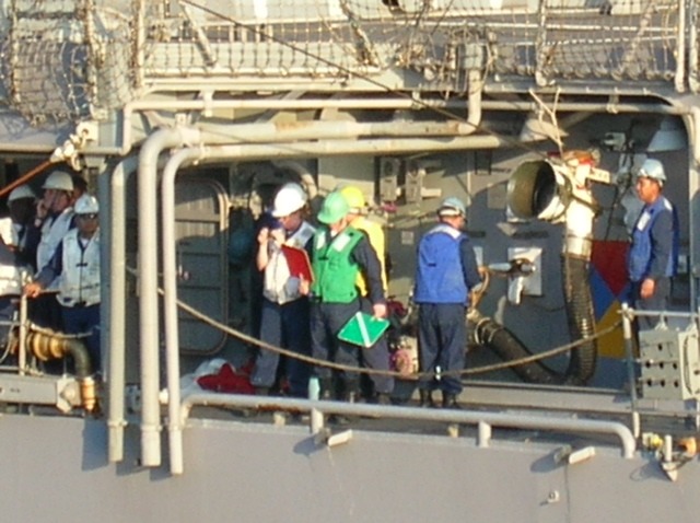 A bit of a better look at the UNREP station on the receiving ship. The wire the hose rides on is attached above the socket with a pelican or McCloney hook. The man in green is holding paddles that are used to communicate between the ships. Each color uniform indicates a different job.