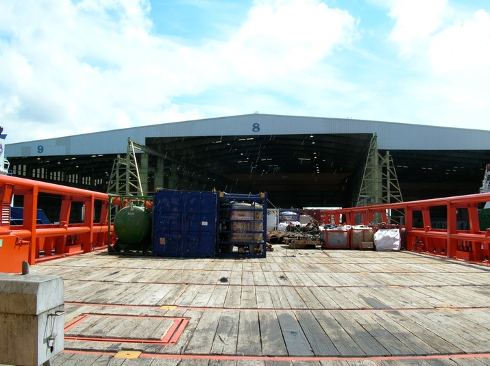 The normal stomping grounds for the Akira Chouest when we're at one of the C-Ports. We're backing into the slip right now which is actually a rather impressive feat. Once in we have about 5 feet of clearance when tied up tight on the other side.