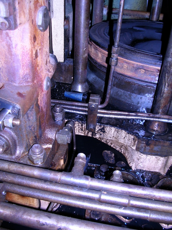 Cylinderheadless cylinder on the Bergen. The Bergen engines are fairly good to work on. The inside round part in the upper right is the crown of the piston, the large rods around it are the cylinder head bolts. The other piping in the front are fuel and and oil lines.
