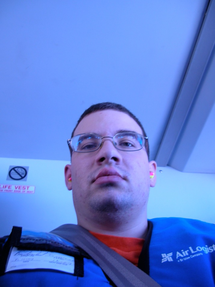 Me in the helicopter. No hat for safety reasons, you can't have loose things with you because when you get out, if they blow away, chances are good that you'll try to go after them with out thinking. Hello tail rotor. That would totally ruin your day. Earplugs because its noisy. In the event of a water landing, your PFD is already around your neck. Wait until you deplane before inflating it otherwise you'll trap everyone including yourself inside.