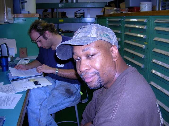 Peter looking over paperwork in the tool room, Kerry chilling out.