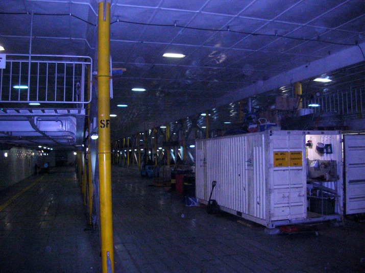 There are two containers for a deck and engine workshop and storage, a reefer container for cold supplies for the marines, and a container with their dry good supplies. We have the capacity to haul 125 HMMWV (Hummvees). We can carry any vehicle the Marines use except for the sea Knight (or king?) helicopter because it won't fit and an M1A1 Abrahms Main Battle Tank because the deck load is to great other than that, its all fair game.