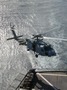 The guy on deck has to hook the sling onto the bottom of the helicopter.